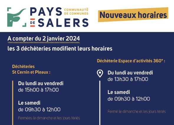 DÉCHÈTERIES PLEAUX ET ST CERNIN :• Du lundi au vendredi : de 15h00 à 17h00• Le samedi : de 09h30 à 12h00• Fermé le dimanche et jours fériés